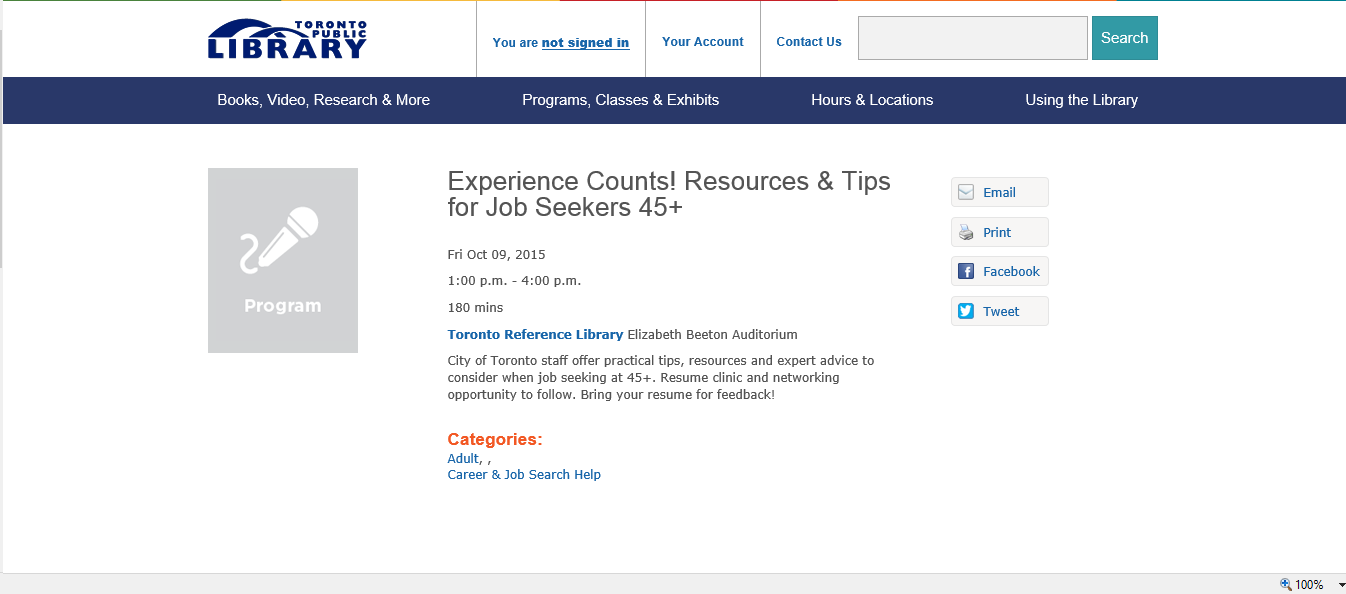 There is a wealth of resources to complete your assessment/inventory available through career and job hunting guide books, public and private job assessment programs or online. I always look to a simple solution, start with a browser search for “personal skills inventory”, GOOGLE came back to me with about 6,250,000 results in 0.36 seconds. I would then narrow down to your local area and look for a no cost starting point. I currently live in the City of Toronto which has an amazing and wonderful Public Library system with great career resources http://www.torontopubliclibrary.ca . Career research and job hunting are one of today’s libraries main focus points with specific group programs and online resources, I am sure there are similar resources where you are located. Down load a skills defining form and do the work yourself or sign up for a free skills definition seminar, included in many programs like the upcoming one in Toronto, October 9th, shown below. Always remember we are trying to stay in the here and now of skills utility not a historical self-congratulatory view of our past. What do we have that is useful, adaptable and wanted in the market place today? Have you reviewed current relevant job descriptions? Like an entrepreneurial, storage unit content buyer, you will want to consult with an expert about the true value of some of your stored experience, but that is for another day’s blog.